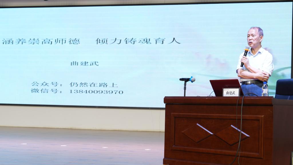 报告会上,曲建武教授作了题为《涵养崇高师德倾力铸魂育人》的专题报告。他结合自己四十余年的学生工作经历,讲述自己教育引导帮扶学生的经历,分享了师生家校交流往来的信函和个人从事学生思想政治教育工作的经验和思考,生动诠释了一位“坚守人生选择无怨无悔、陪伴学生健康成长一辈子”的基层辅导员,“最美奋斗者”的不变追求。他指出,学校要构建全员育人的文化,做到“高校无闲人、人人都育人,高校无闲事,事事都育人;高校无闲时,时时都育人,高校无闲处,处处都育人”。他强调,辅导员、班主任老师要做一个理想主义者,心中有学生,守望青春、陪伴成长,向下扎根、向上生长。工作中要把握好思想政治教育和心理健康教育的关系,把握好以情感人与以理服人的关系,把握好辅导员科研与工作的关系,引导学生规划人生、完整人格、健全品格,一定要坚信教育的力量和陪伴的责任。